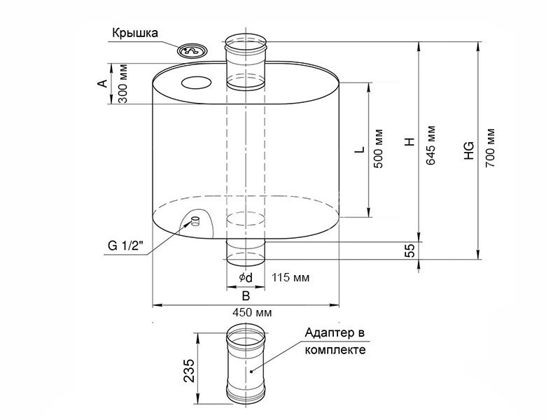 Установка бака производится "по конденсату". Нижняя часть трубы бака теперь разъемная. Проверенный честный объём бака. Адаптер М-М 235 мм в комплекте!