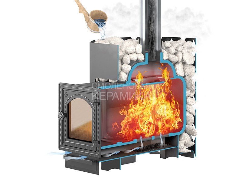 Преимущество банной печи в том, что топка печи состоит из 3-х Чугунных элементов (ГОСТ 1412-85) толщиной до 8мм. На стыке между ними используется керамический шнур с рабочей температурой 1200 градусов. То есть топка печи абсолютно герметична! Для фиксации деталей между собой применяется болтовое соединение, что даёт 100% гарантию безопасности при эксплуатации.
