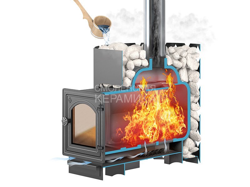 Преимущество банной печи в том, что топка печи состоит из 3-х Чугунных элементов (ГОСТ 1412-85) толщиной до 8мм. На стыке между ними используется керамический шнур с рабочей температурой 1200 градусов. То есть топка печи абсолютно герметична! Для фиксации деталей между собой применяется болтовое соединение, что даёт 100% гарантию безопасности при эксплуатации.
