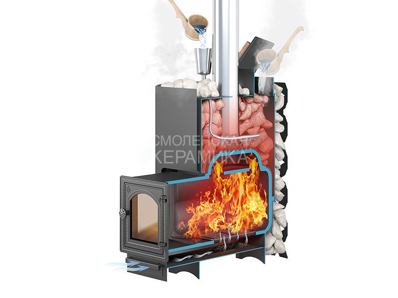 Преимущество банной печи в том, что топка печи состоит из 3-х Чугунных элементов (ГОСТ 1412-85) толщиной до 8мм. На стыке между ними используется керамический шнур с рабочей температурой 1200 градусов. То есть топка печи абсолютно герметична! Для фиксации деталей между собой применяется болтовое соединение, что даёт 100% гарантию безопасности при эксплуатации.