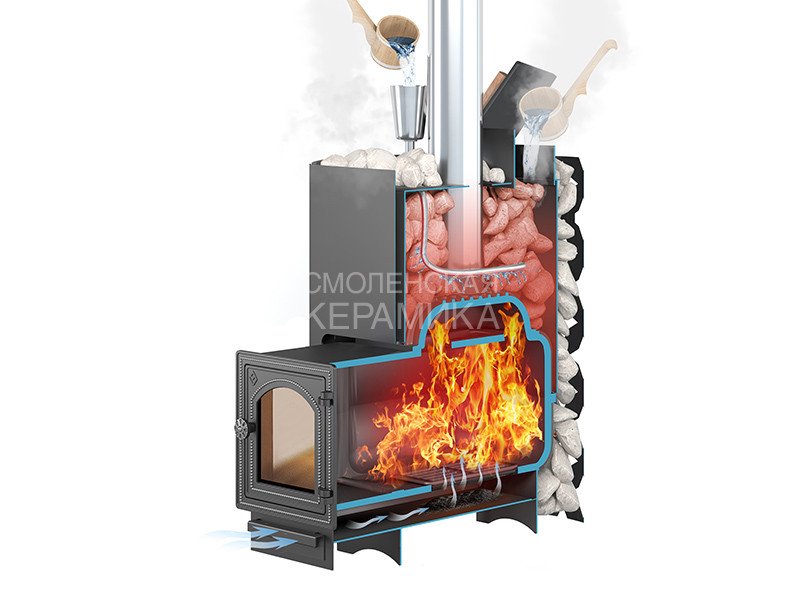 Преимущество банной печи в том, что топка печи состоит из 3-х Чугунных элементов (ГОСТ 1412-85) толщиной до 8мм. На стыке между ними используется керамический шнур с рабочей температурой 1200 градусов. То есть топка печи абсолютно герметична! Для фиксации деталей между собой применяется болтовое соединение, что даёт 100% гарантию безопасности при эксплуатации.