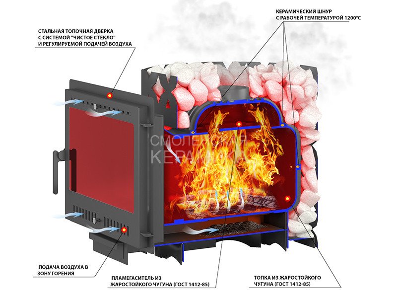 Преимущество банной печи в том, что топка печи состоит из 3-х Чугунных элементов (ГОСТ 1412-85) толщиной до 8мм. На стыке между ними используется керамический шнур с рабочей температурой 1200 градусов. То есть топка печи абсолютно герметична! Для фиксации деталей между собой применяется болтовое соединение, что даёт 100% гарантию безопасности при эксплуатации.
