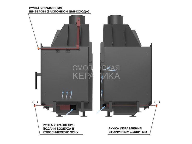 Все элементы управления выведены на переднюю поверхность самой каминной топки.