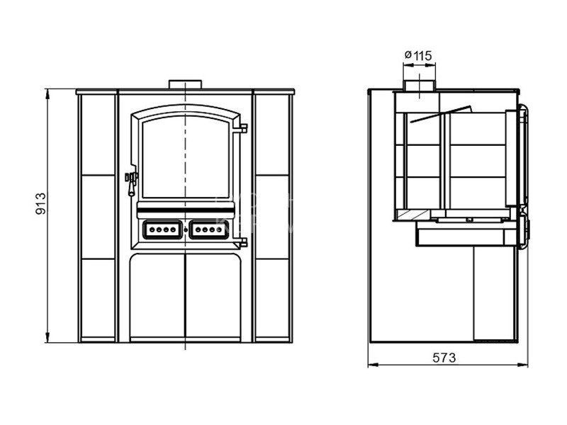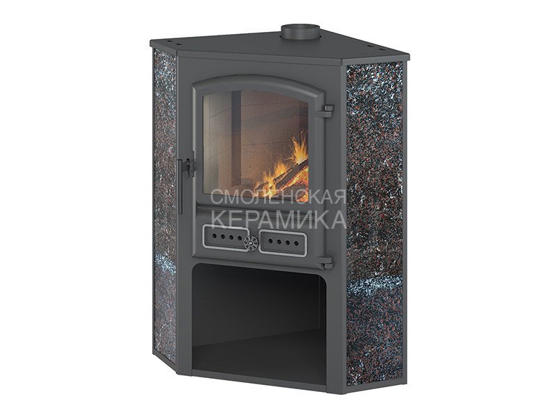 Печь-каминв ключает в свою конструкцию топочную камеру с поддувалом и дымосборником, а также дополнительные боковые стенки, облицованные керамическими плитками чёрного или бежевого цвета. При этом топка располагается в верхней части печи-камина, а нижняя свободная часть может быть использована в качестве дровника.
