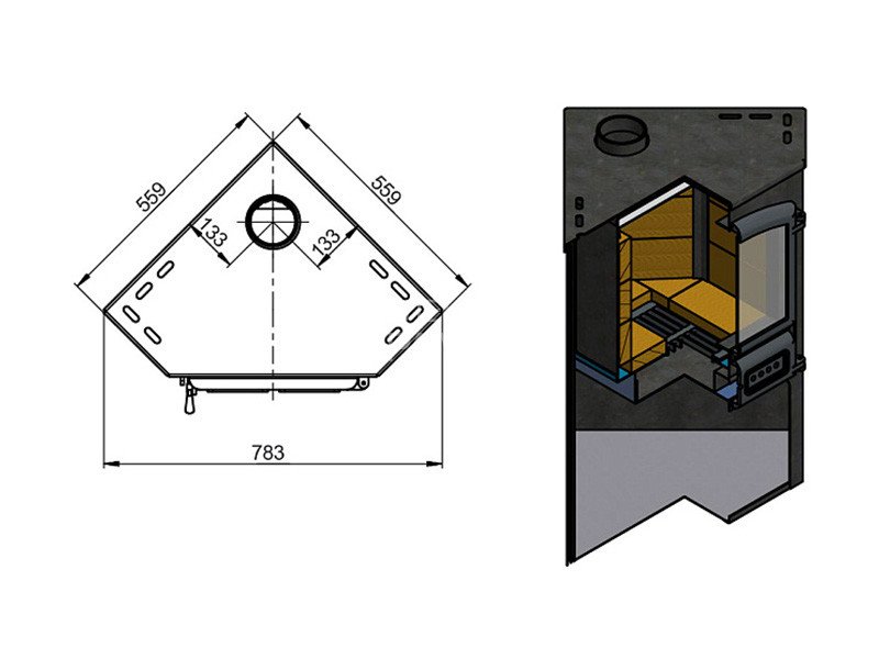 Печь-камин комплектуется чугунной дверкой с остеклением БКД и чугунной плитой на верхней поверхности печи, дополненной съёмными конфорками.