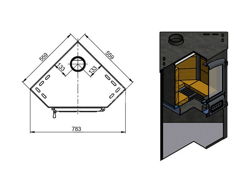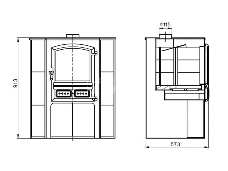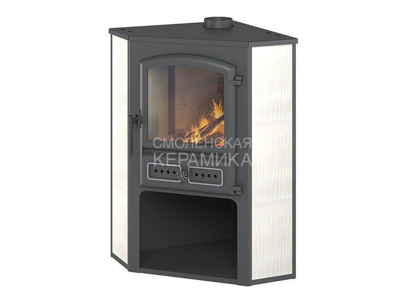 Печь-каминв ключает в свою конструкцию топочную камеру с поддувалом и дымосборником, а также дополнительные боковые стенки, облицованные керамическими плитками чёрного или бежевого цвета. При этом топка располагается в верхней части печи-камина, а нижняя свободная часть может быть использована в качестве дровника.