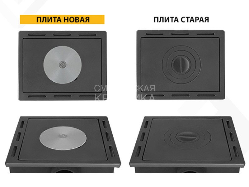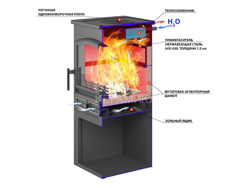 Печь-камин комплектуется чугунной дверкой с остеклением ДТ-4С и чугунной плитой на верхней поверхности печи, дополненной съёмными конфорками. В конструкцию печи-камина включён теплообменник, позволяющий на базе этого теплового агрегата организовать водяное отопление в смежных помещениях.