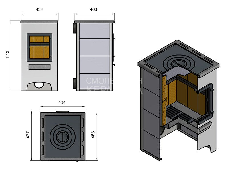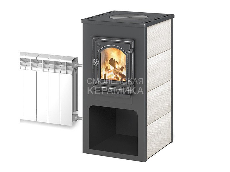 Печь-камин включает в свою конструкцию топочную камеру с поддувалом и дымосборником, а также дополнительные боковые стенки, облицованные керамическими