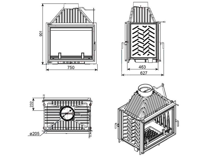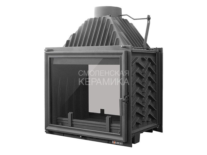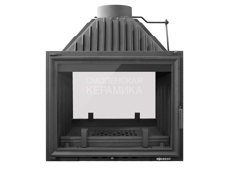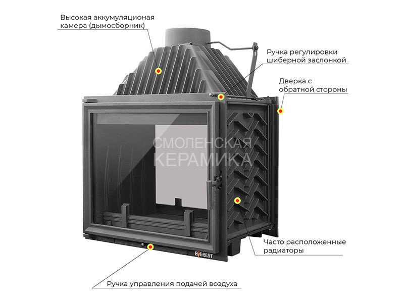 Каминная топка EVEREST A16H имеет топочную дверь установленную как с передней, так и с задней части. Топка изготовлена из качественного жаростойкого чугуна (ГОСТ 1412-85) с толщиной стенок 6-10 мм. Вес топки составляет 195 кг. Модель рассчитана на обогрев помещений объёмом до 320 м³. Каминная топка имеет высокую аккумуляционную камеру (дымосборник) и часто расположенные радиаторы на корпусе топки, которые обеспечивают высокий КПД и увеличивают мощность до 16 кВт. В аккумуляционной камере (дымосборнике) установлен чугунный пламегаситель. Патрубок дымохода с внутренним диаметром 203 мм, оснащён поворотным шибером. Заслонка изготовлена из чугуна, а её положение регулируется ручкой на передней панели топки.