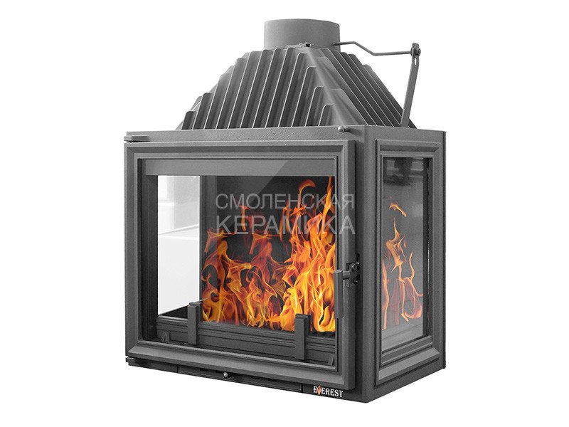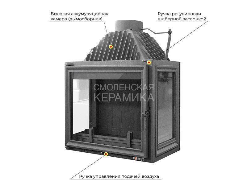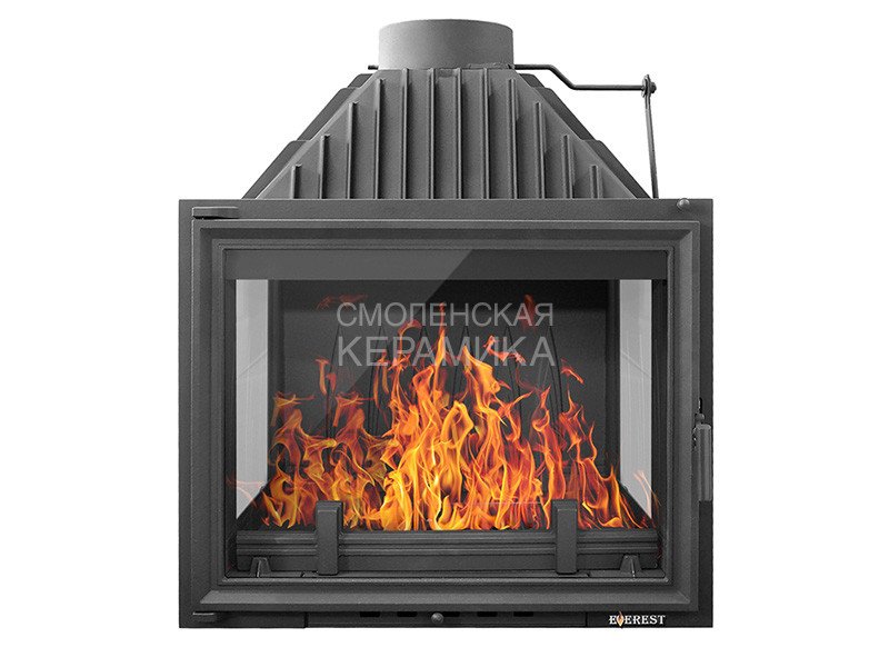 Каминная топка EVEREST A16P имеет с правой и с левой стороны дополнительное остекление. Топка изготовлена из качественного жаростойкого чугуна (ГОСТ 1412-85) с толщиной стенок 6-10 мм. Вес топки составляет 199кг. Модель рассчитана на обогрев помещений объёмом до 320 м³. Каминная топка имеет высокую аккумуляционную камеру (дымосборник) и часто расположенные радиаторы на корпусе топки, которые обеспечивают высокий КПД и увеличивают мощность до 16 кВт. В аккумуляционной камере (дымосборнике) установлен чугунный пламегаситель. Патрубок дымохода с внутренним диаметром 205 мм, оснащён поворотным шибером. Заслонка изготовлена из чугуна, а её положение регулируется ручкой на передней панели топки.