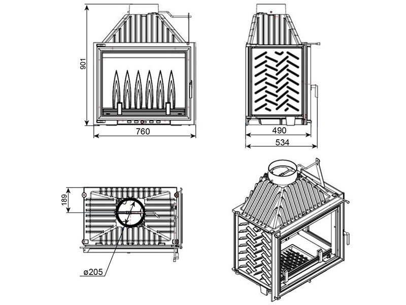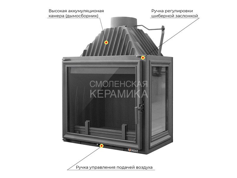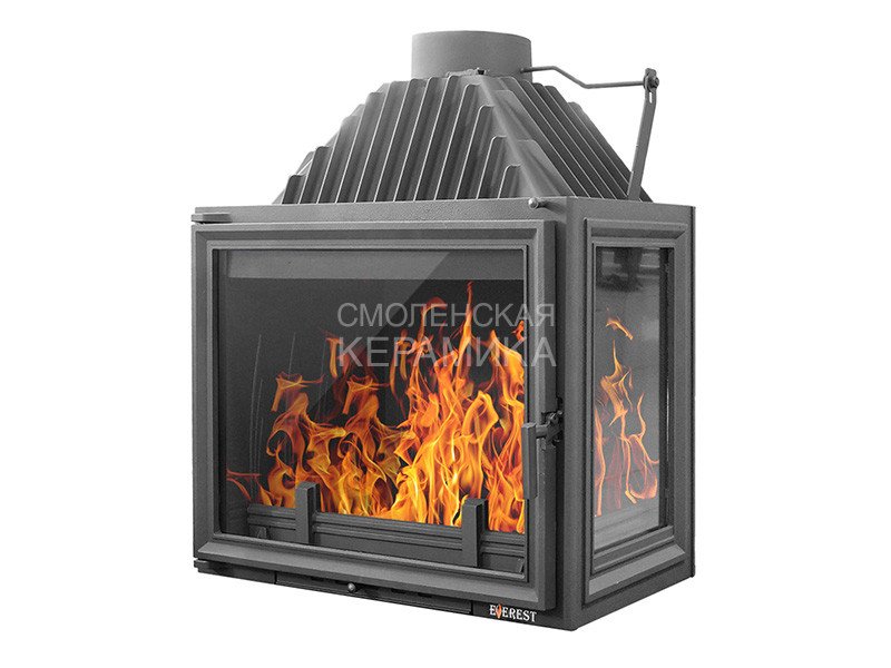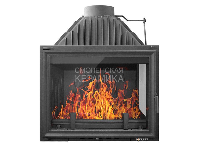 Каминная топка EVEREST A16R имеет с правой стороны дополнительное остекление. Топка изготовлена из качественного жаростойкого чугуна (ГОСТ 1412-85) с толщиной стенок 6-10 мм. Вес топки составляет 186 кг. Модель рассчитана на обогрев помещений объёмом до 320 м³. Каминная топка имеет высокую аккумуляционную камеру (дымосборник) и часто расположенные радиаторы на корпусе топки, которые обеспечивают высокий КПД и увеличивают мощность до 16 кВт. В аккумуляционной камере (дымосборнике) установлен чугунный пламегаситель. Патрубок дымохода с внутренним диаметром 203 мм, оснащён поворотным шибером. Заслонка изготовлена из чугуна, а её положение регулируется ручкой на передней панели топки.