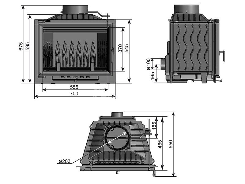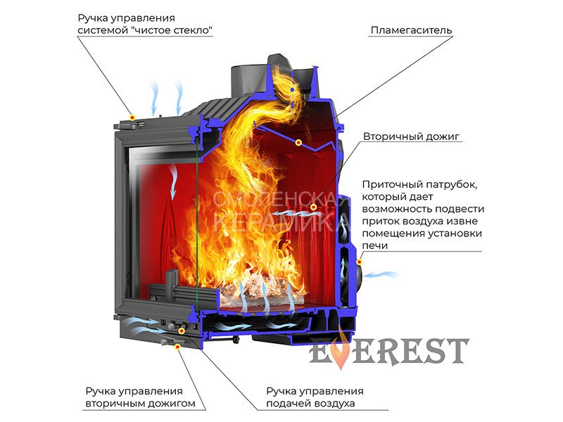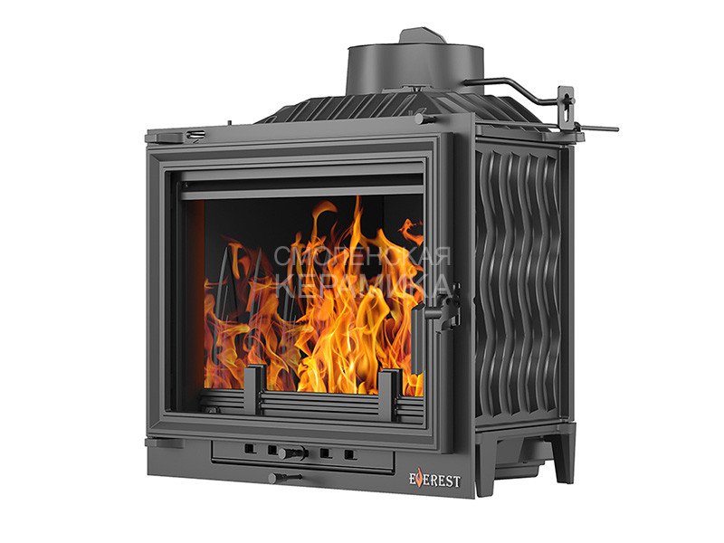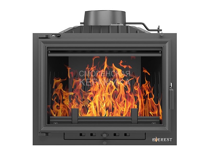 Каминная топка EVEREST V14 изготовлена из качественного жаростойкого чугуна с толщиной стенок 6-8мм. Вес печи составляет 120 кг. Модель рассчитана на обогрев помещений объёмом до 280м³. Каминная топка имеет пламегаситель, который обеспечивает высокий КПД . Топка усилена чугунной задней вставкой с системой вторичного дожига. С помощью этой функции по каналам подачи вторичного воздуха поступает воздух, который нагревается при прохождении между топочной камерой и стенками корпуса. Далее нагретый воздух через дефлектор поступает в топку, перемешивается с газами - продуктами горения, чем вызывает повторное возгорание. Регулировка этой системы, осуществляется рычагом, расположенным в нижней части топки. На зольном ящике имеется ручка регулировки подачи воздуха в топку в колосниковую зону. В левой верхней части расположена ручка регулировки системы чистое стекло, которая препятствует оседанию сажи на внутреннюю поверхность стекла. На задней стенке расположен приточный патрубок диаметром 100мм, который дает возможнос