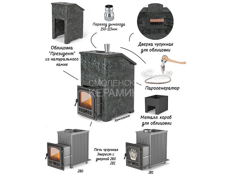 Комплект ПРЕЗИДЕНТ "ЭВЕРЕСТ 24 (280)" ПИРОКСЕНИТ имеет эксклюзивный дизайн и удачно впишется в практически любой интерьер парного помещения. Облицовка из натурального камня придаст интерьеру лоск и респектабельность.