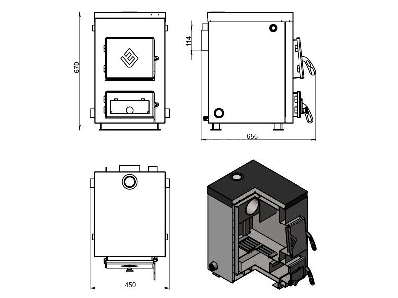 К котлу возможно подключение регулятора, с помощью которого автоматически ограничивается тяга и интенсивность горения дров.