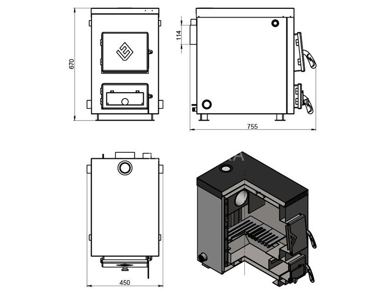 К котлу возможно подключение регулятора, с помощью которого автоматически ограничивается тяга и интенсивность горения дров.
