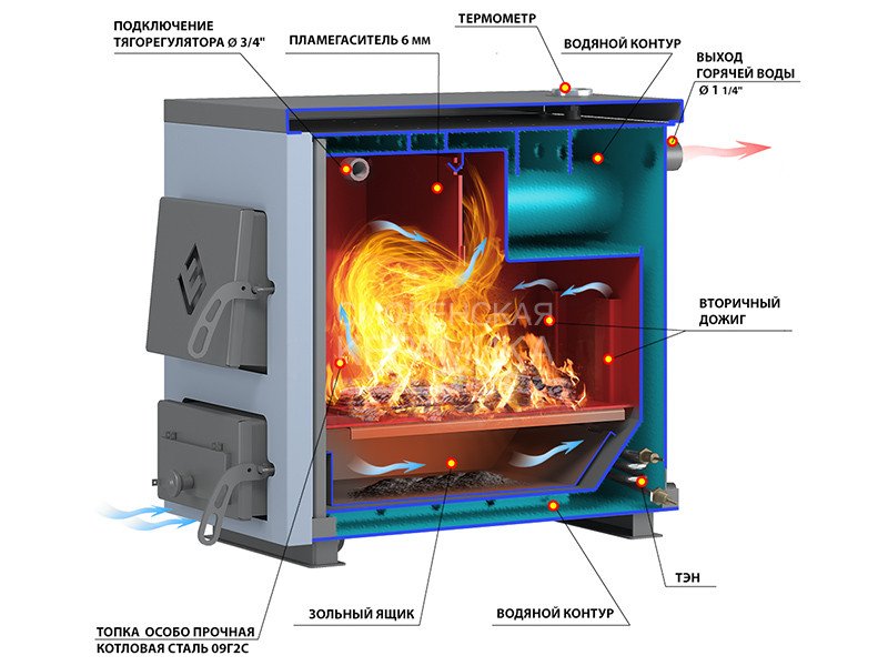 Котлы работают на твердом топливе: дровах и топливных брикетах.
