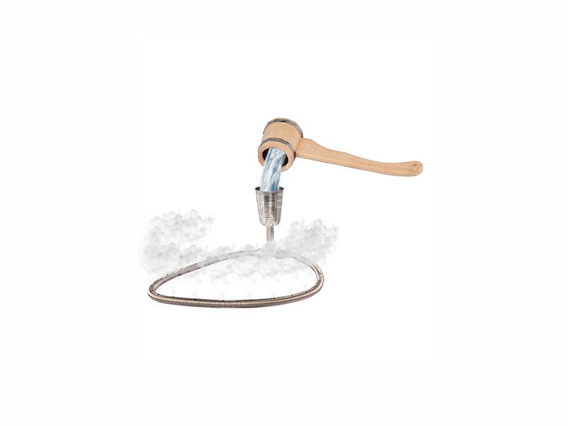 Трубка парогенератора сделана в виде гибкого кольца, чтобы количество воды, подаваемой в разные стороны каменки, было одинаковым и камни слева и справа от парогенератора имели одинаковую температуру.