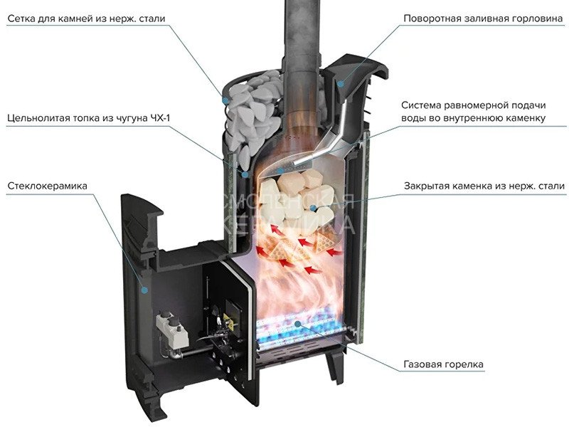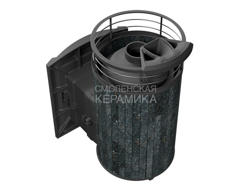 Практичная и компактная модель. Ламели из пироксенита по периметру внешней каменки не только обладают хорошими теплонакопительными свойствами, но и придают печи оригинальный внешний вид.