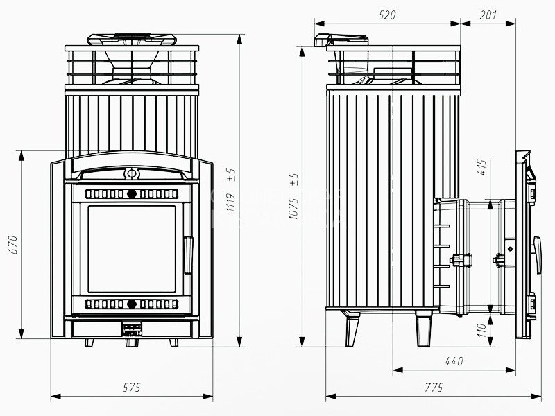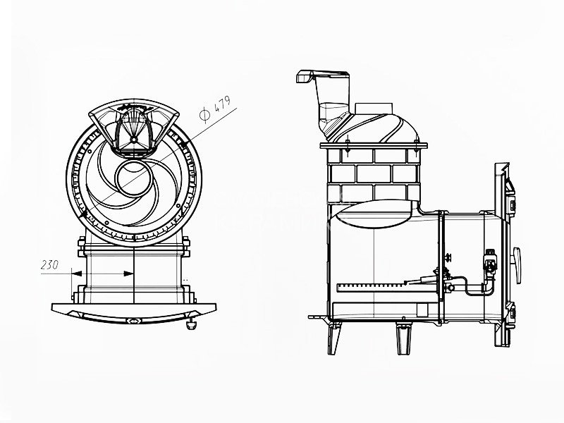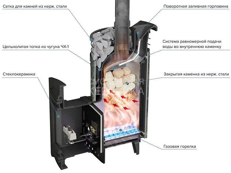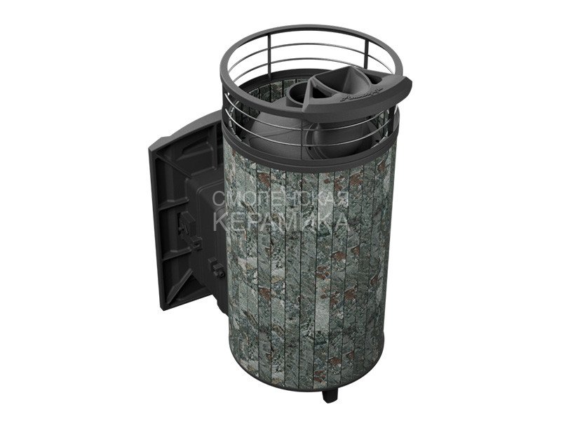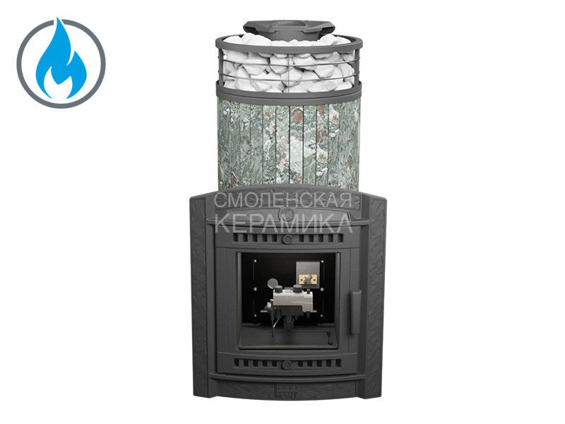 Модель с увеличенной каменкой и повышенной производительностью. Ламели по периметру внешней каменки не только обладают хорошими теплонакопительными свойствами, но и придают печи оригинальный внешний вид