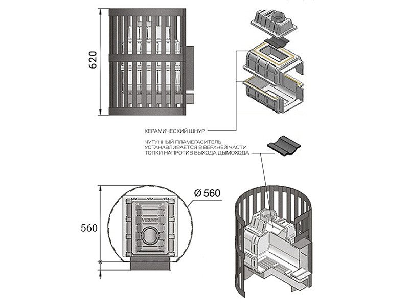 Преимущество печи в том, что топка печи состоит из 3-х элементов. На стыке между ними используется керамический шнур с рабочей температурой 1200 градусов. То есть топка печи абсолютно герметична! Для фиксации деталей между собой применяется болтовое соединение, что даёт 100% гарантию безопасности при эксплуатации.