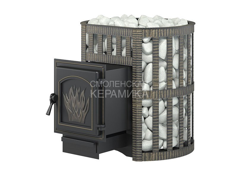Банная чугунная печь Легенда Ковка 16 (271) укомплектована чугунной герметичной дверцей Везувий 271. Конвекционно-вентилируемый кожух "Ковка" изготовлен из металлической текстурированной полосы покрашенной термостойкой краской и покрытая патиной «Бронза».