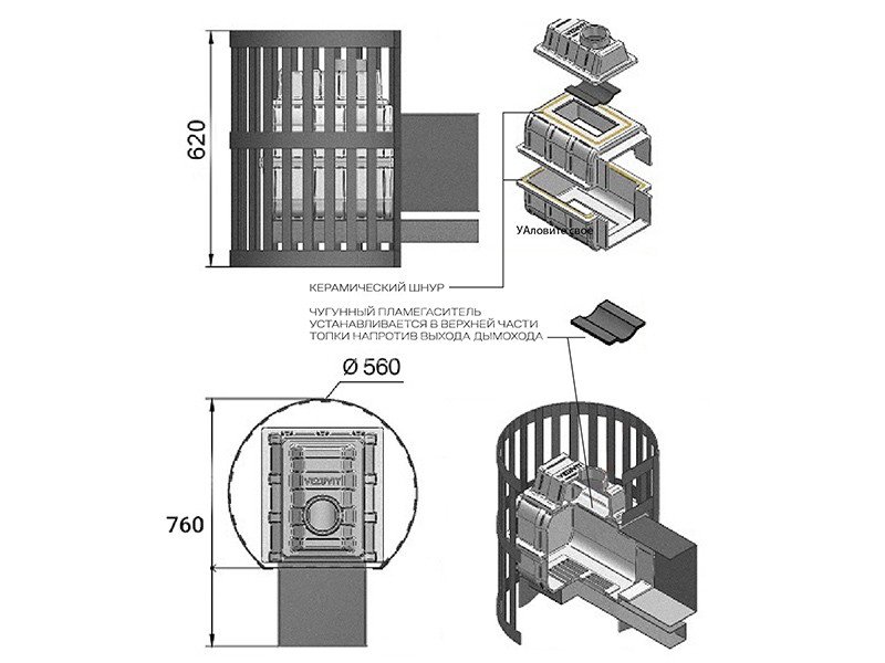 Преимущество печи в том, что топка печи состоит из 3-х элементов. На стыке между ними используется керамический шнур с рабочей температурой 1200 градусов. То есть топка печи абсолютно герметична! Для фиксации деталей между собой применяется болтовое соединение, что даёт 100% гарантию безопасности при эксплуатации.