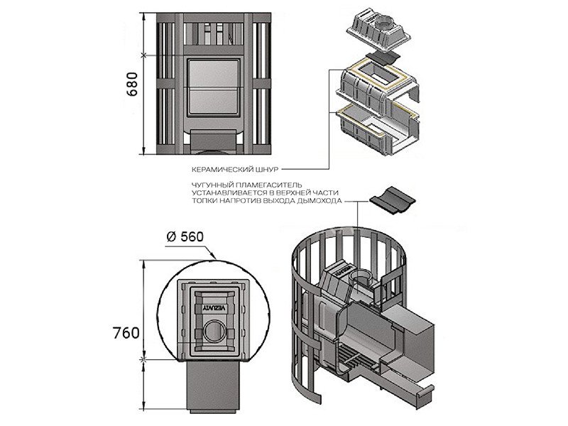 Преимущество печи в том, что топка печи состоит из 3-х элементов. На стыке между ними используется керамический шнур с рабочей температурой 1200 градусов. То есть топка печи абсолютно герметична! Для фиксации деталей между собой применяется болтовое соидинение, что даёт 100% гарантию безопасности при эксплуатации.