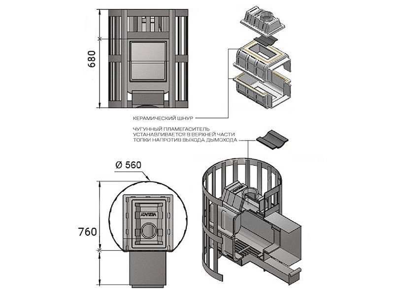 Преимущество печи в том, что топка печи состоит из 3-х элементов. На стыке между ними используется керамический шнур с рабочей температурой 1200 градусов. То есть топка печи абсолютно герметична! Для фиксации деталей между собой применяется болтовое соединение, что даёт 100% гарантию безопасности при эксплуатации.
