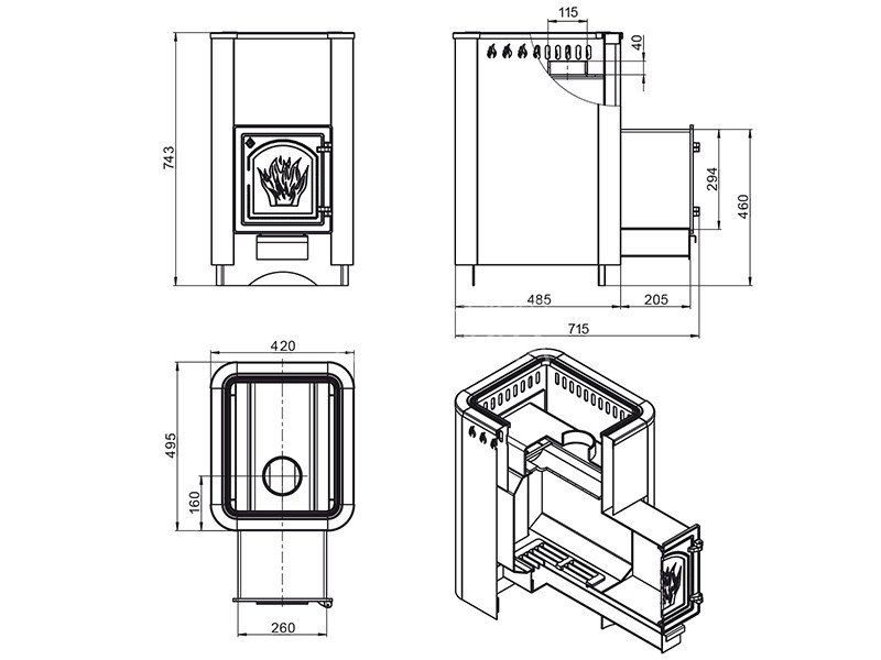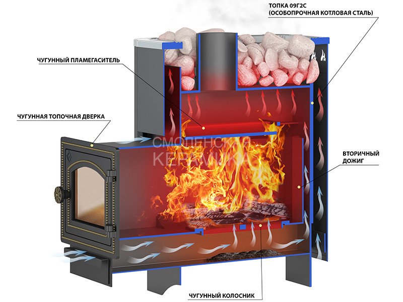 Преимущество печи Русичъ;1. Особо прочная котловая сталь марки 09Г2С 6-8мм2. Чугунный зуб отбойник3. Чугунная топочная дверь4. Чугунная колосниковая решётка5. Конвекционно-вентилируемый кожух вмещающий до 50кг камней6. Срок службы 10 лет