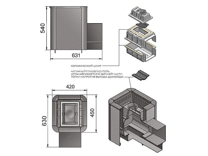 Преимущество печи в том, что топка печи состоит из 3-х элементов. На стыке между ними используется керамический шнур с рабочей температурой 1200 градусов. То есть топка печи абсолютно герметична! Для фиксации деталей между собой применяется болтовое соединение, что даёт 100% гарантию безопасности при эксплуатации.
