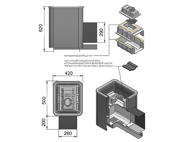 Преимущество печи в том, что топка печи состоит из 3-х элементов. На стыке между ними используется керамический шнур с рабочей температурой 1200 градусов. То есть топка печи абсолютно герметична! Для фиксации деталей между собой применяется болтовое соединение, что даёт 100% гарантию безопасности при эксплуатации.