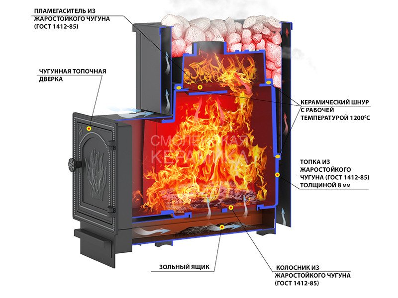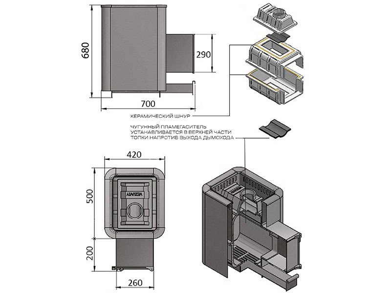 Преимущество печи в том, что топка печи состоит из 3-х элементов. На стыке между ними используется керамический шнур с рабочей температурой 1200 градусов. То есть топка печи абсолютно герметична! Для фиксации деталей между собой применяется болтовое соединение, что даёт 100% гарантию безопасности при эксплуатации.