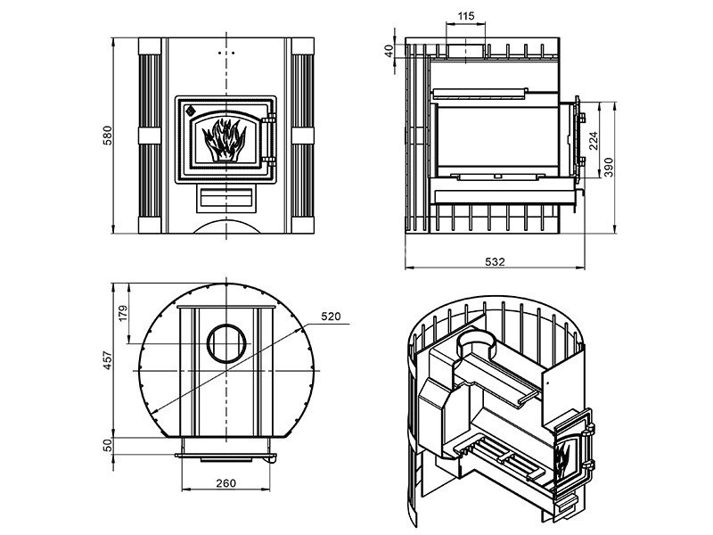 Съёмный чугунный колосник в сочетании со скошенными краями боковой части стенки облегчает уход за топкой, уборки золы и несгоревших углей.
