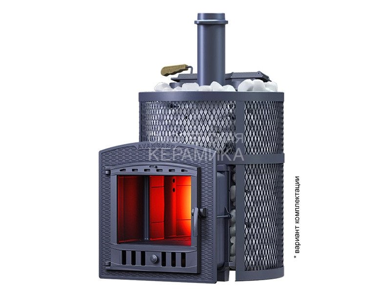 Масса пароиспарителя в печи AVANGARD 35 – 56 кг, и он нагревается прямым контактом с пламенем. У пароиспарителя 2 поверхности с увеличенной рабочей площадью – снизу идёт нагрев огнём, а сверху поддаётся вода для пара. У печи уникальная, массивная каменка с теплонакопительными воронками, для получения легкого пара.