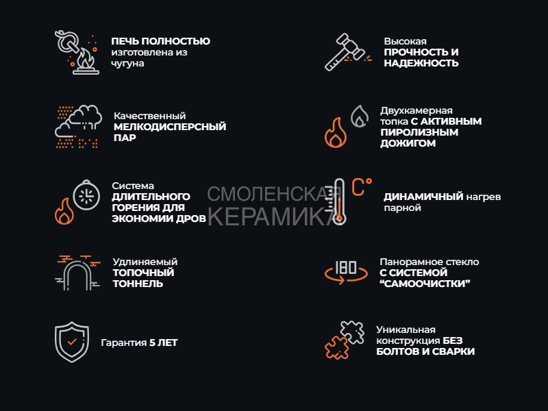 GROZA 24 (П)2 — это современные печи, рассчитанные на малые и средние размеры парных. Печь имеет прочную сборную конструкцию, без резьбовых и сварных соединений, детали выполнены из легированного чугуна. Топка печей «Гроза» состоит из двух камер, разделенных пламегасителем. Радиаторные выступы каменки, направленные вглубь топки, увеличивают площадь контакта огня с каменкой и эффективность теплосъема.