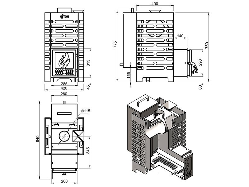 Толщина закрытой каменки: 4 мм
