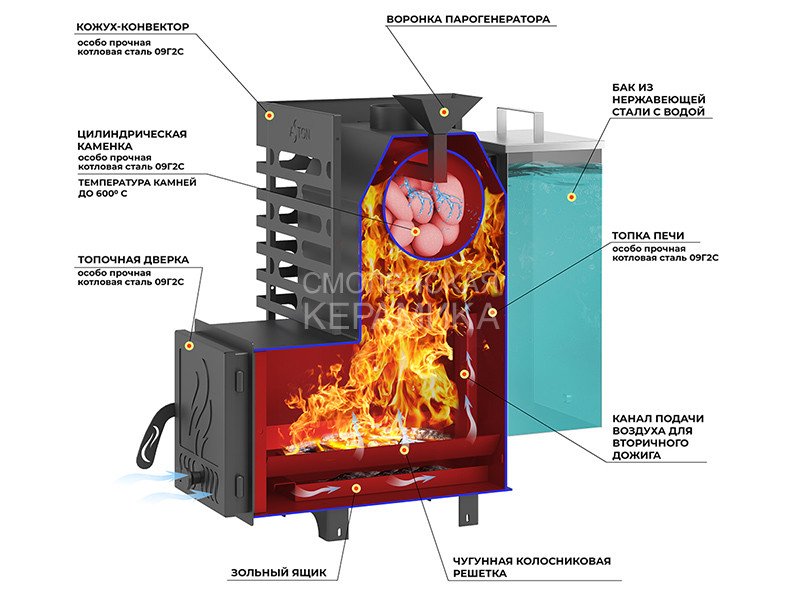 Материал закрытой каменки: Особо прочная котловая сталь