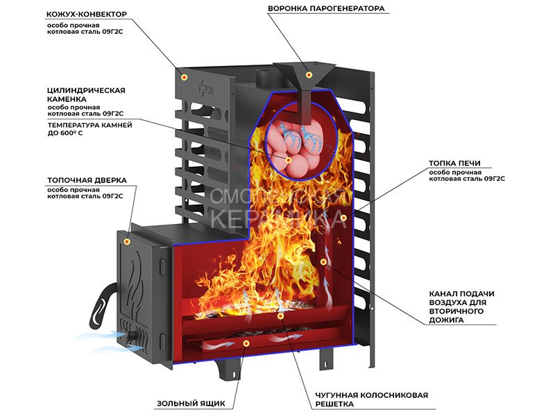 Материал закрытой каменки: Особо прочная котловая сталь