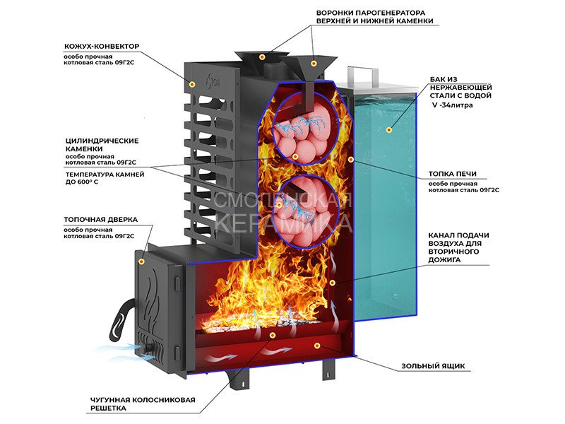 Материал закрытой каменки: Особо прочная котловая сталь