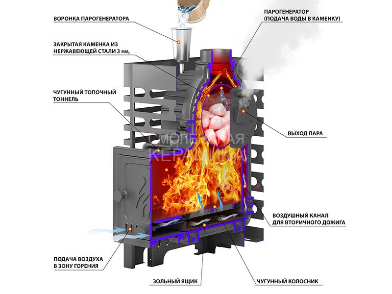 Закрытая каменка из нержавейки, размещённая в самом горячем месте печи.