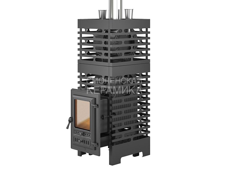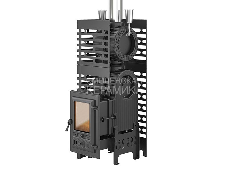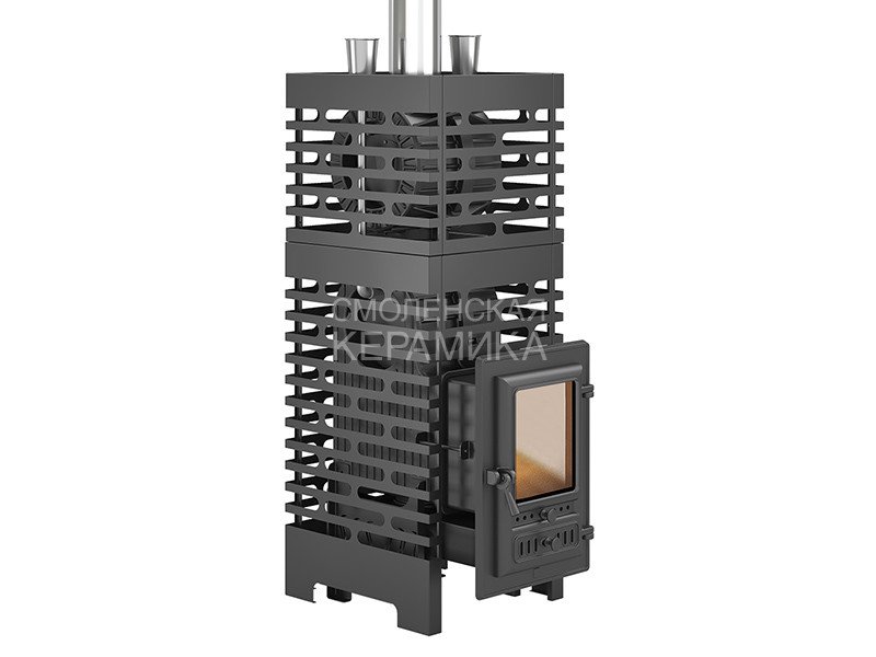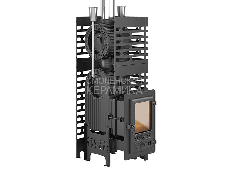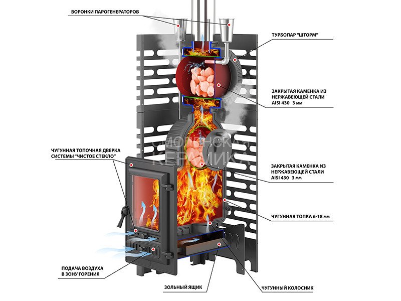 Чугунная печь состоит из двух вертикальных полукорпусов, соединяющихся на болтах. Качественный чугун позволяет накапливать много энергии от горения дров и быстро передавать её камням, размещённым внутри печи и в сетке вокруг теплового агрегата.