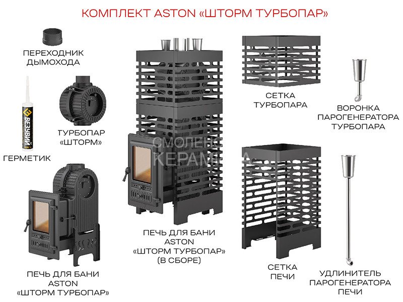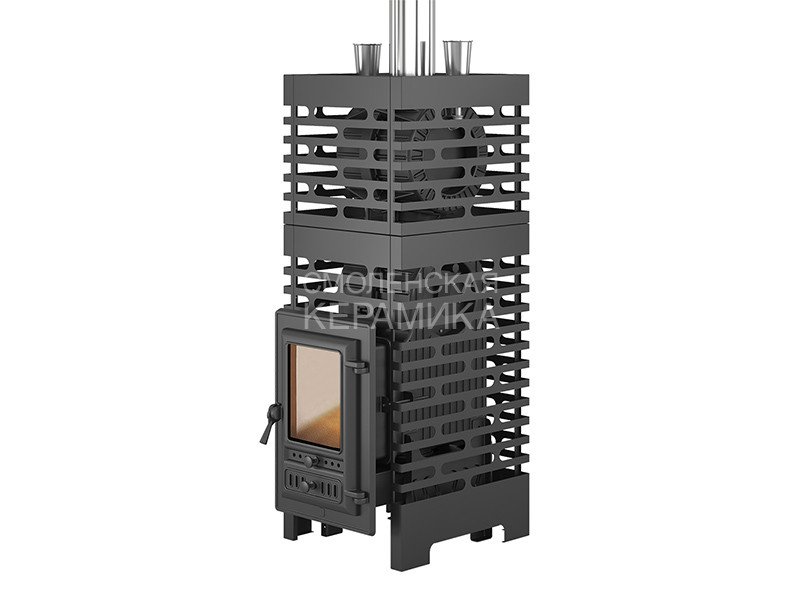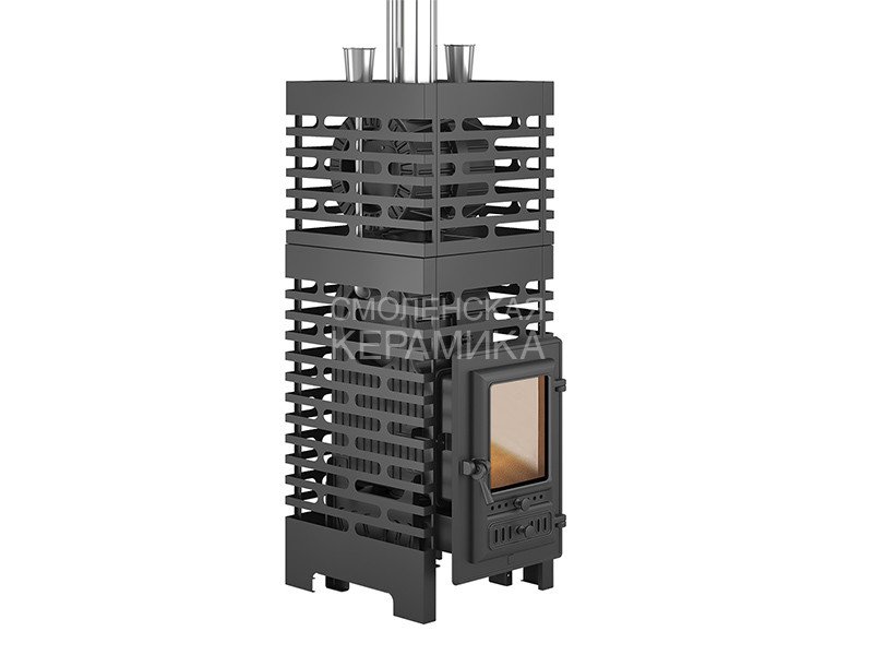 Чугунная печь состоит из двух вертикальных полукорпусов, соединяющихся на болтах. Качественный чугун позволяет накапливать много энергии от горения дров и быстро передавать её камням, размещённым внутри печи и в сетке вокруг теплового агрегата.