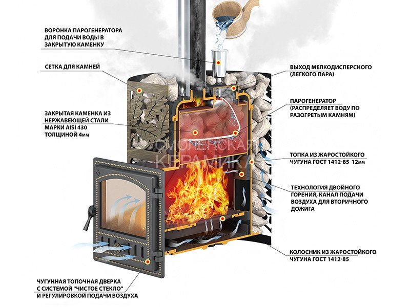 Банные печи Эверест Лёгкий Пар из жаропрочного чугуна отличает наличие закрытой каменки, выполненной из экологичной, экономичной нержавеющей стали марки AISI 430. Капельная подача воды, через специальную систему в закрытую каменку, позволяет получить качественный перегретый мелкодисперсный пар в нужных количествах, не боясь залива каменки. При этом лучшие характеристики линейки печей Эверест из жаропрочного чугуна остались на высоком уровне:заводской чугун оптимальной толщины;большая теплоёмкость;значительная мощность печи;простая для установки конструкция.
