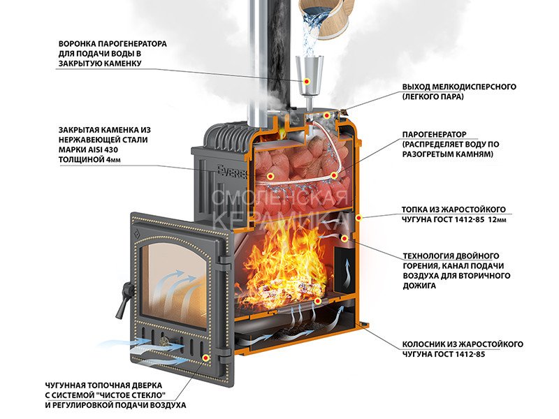 Топка банной печи «Эверест Лёгкий Пар» изготовлена из высококачественного жаростойкого чугуна. На месте пламегасителя в верхней части топки размещена закрытая каменка из нержавеющей стали толщиной 3 миллиметра. Объём каменки рассчитан на 25-30 килограммов камней.