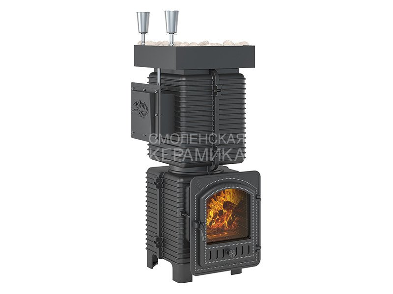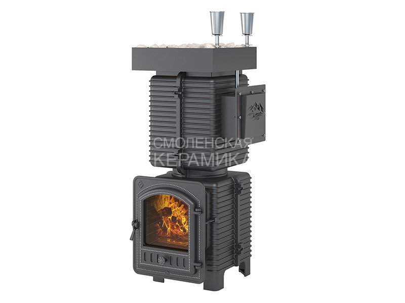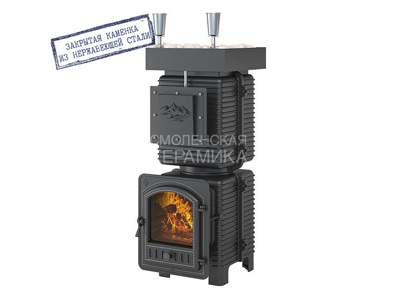Печь состоит из двух модулей: топочной камеры из чугуна и закрытой каменки из нержавеющей стали. Наиболее термонагруженные участки печи сделаны из жаропрочного чугуна толщиной 20 мм.
