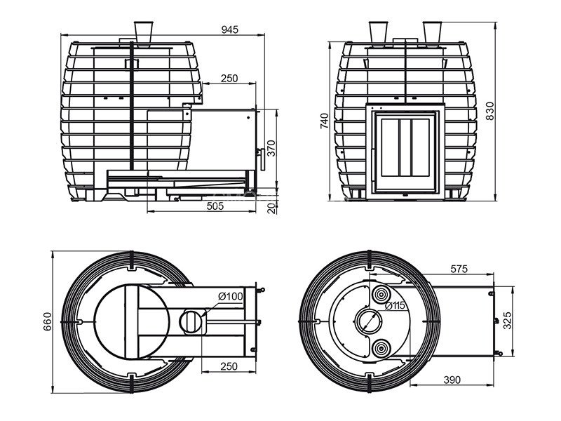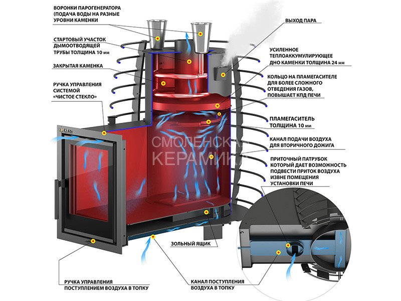 Стартовый участок дымоотводящей трубы толщиной 10 мм и диаметром 115 мм предназначен для максимального теплосъёма, он увеличивает площадь нагрева заклада внутри каменки, что быстрее выводит печь в рабочий режим. Дно закрытой каменки толщиной 24 мм не только разделяет простр