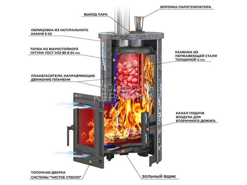 Топочная камера печи – сборная, состоит из трёх деталей, соединяемых между собой на болтах. Вертикальные швы по краю деталей соединяются по принципу паз-гребень, что обеспечивает высокую герметичность топки и минимальную деформацию даже при длительном нагреве. Верхняя часть топки изготовлена из чугунных колец. В печи между топкой и крышкой размещено два кольца высотой 120 мм.