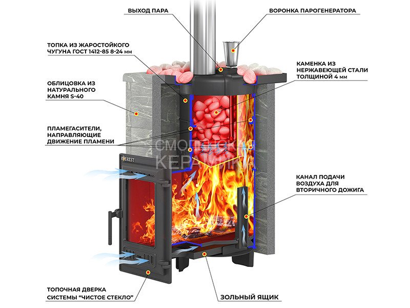 Банная печь предназначена для нагрева помещений и получения пара в парных . Печь изготовлена из Жаростойкого чугуна и отличается интересной конструкцией. Толщина топки составляет от 8 до 24 мм, в зависимости от детали печи (наиболее термонагруженные участки имеют большую толщину чугуна). Топочная камера печи – сборная, состоит из трёх деталей, соединяемых между собой на болтах. Вертикальные швы по краю деталей соединяются по принципу паз-гребень, что обеспечивает высокую герметичность топки и минимальную деформацию даже при длительном нагреве.