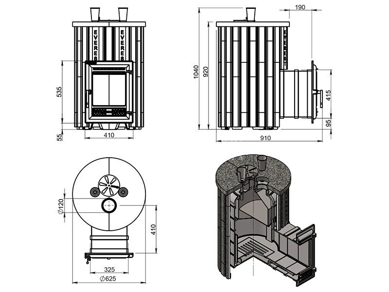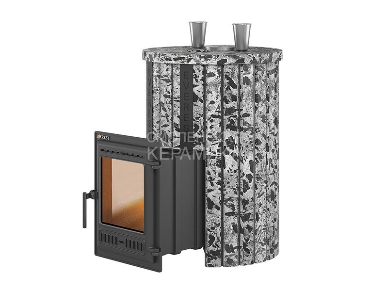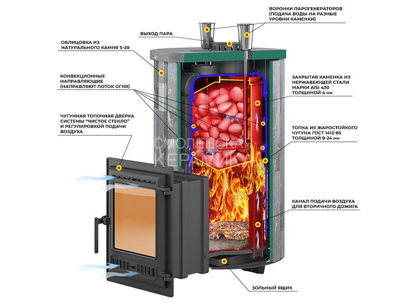 Закрытая каменка печи изготовлена из нержавеющей стали марки AISI 430 толщиной 4 мм. Каменка размещается прямо на пути пламени и горящих газов, что позволяет нагревать камни со всех сторон и быстро достигать температуры 450-500°C. Форма каменки обеспечивает максимальное снятие энергии с горящих в топке дров. Объём топки рассчитан на размещение 25-40 кг камней для бани. Для подачи воды в каменку предусмотрены 2 заливные воронки, направляющие воду в нижний и средний ярус заклада каменки. Облицовка сделана из отдельных планок или полос натурального пироксенита элит – брашированного пироксенита тёмно-серого оттенка.