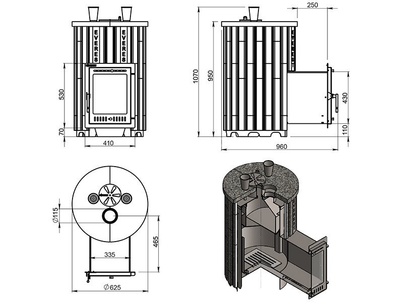 Печь и облицовка – цилиндрической формы, компактная и удобно размещаемая в парилке. Выносной тоннель при монтаже печи проводится через стену и предполагает обслуживание печи из смежного помещения.